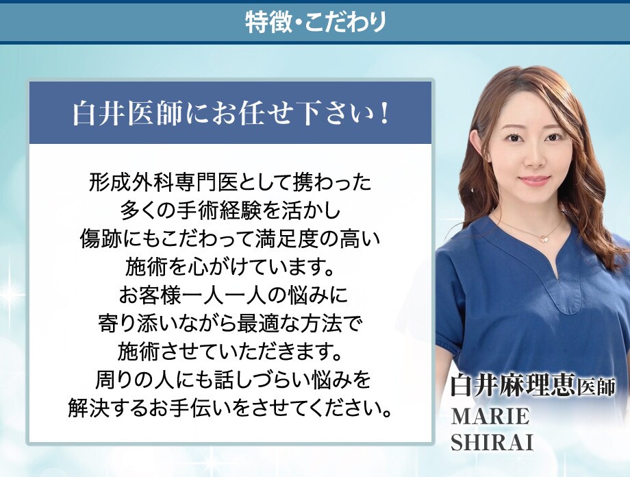 当院の白井麻里恵医師は形成外科専門医の資格を保有しており、安心して施術を受けていただけます。