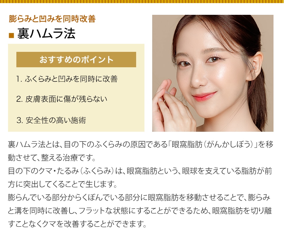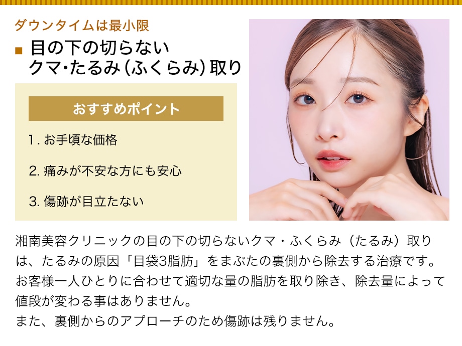 目の下の切らないクマ・たるみ取りは、下まぶたの裏側(結膜)からアプローチして目の下のたるみの原因となっている脂肪を除去する手術です。お顔の表面にはきずを残さず、ダウンタイムも少ない治療で、術直後から若々しい印象のお目元を実現します。