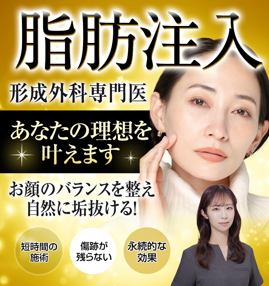ナチュラル脂肪注射(脂肪注入)は、太ももから採取した自らの脂肪を、お顔のシワやへこみ感・ボリュームの気になる部分に注入する手術です。キズとしては、お顔の表面には小さな注射痕ができるのみ(太ももの付け根のキズはきれいに縫合します)で、ダウンタイムも少ない治療です。目の下やゴルゴ線の部分の凹を凸に変えることで、中顔面の位置が中央内側に上がり、よりお顔の印象を美しく変えることができます。法令線や口角下など口周りの年齢が出やすい部分に脂肪を注入することで、凹みが解消され皮膚のハリがでて、より若々しい印象となります。お悩みに応じて、バランスよくお顔の他の部分にも同時に注入できますので、お気軽にご相談ください。