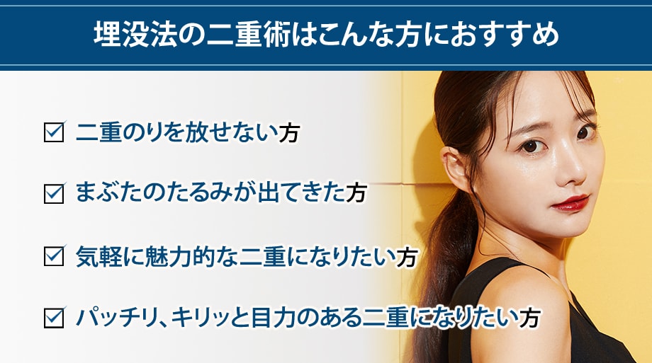 埋没法とは、医療用の細い糸をまぶたの皮下に埋没固定し、二重のラインを作る方法です。