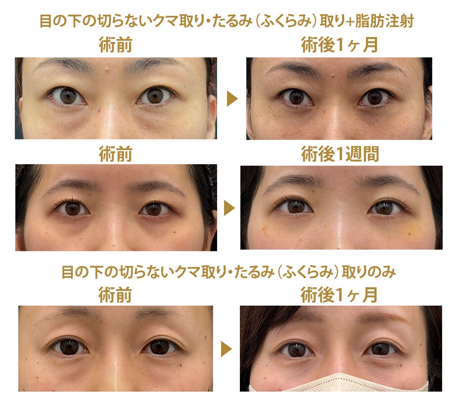 目の下の切らないクマ・たるみ(ふくらみ)取り(麻酔(局所麻酔)代が含まれています。※別途安心麻酔(静脈麻酔)代がかかります。 ) | 79,100円 |