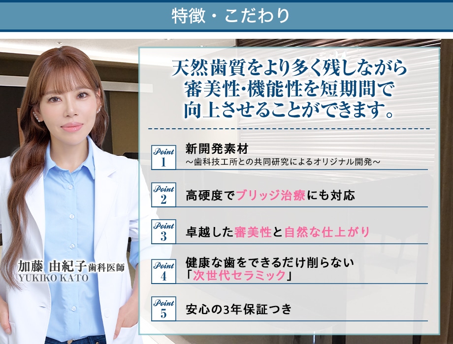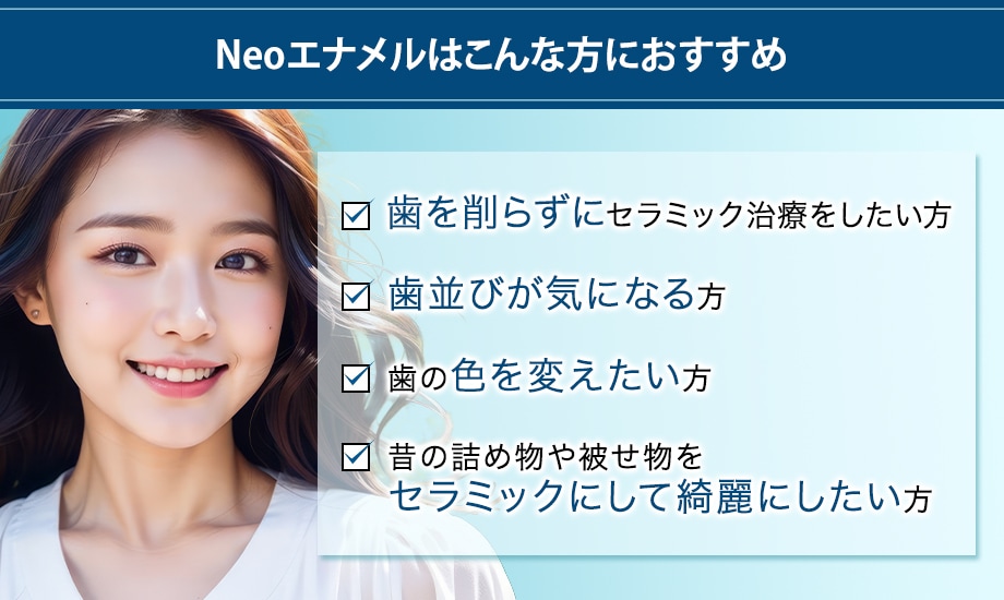 Neoエナメルは、歯をほとんど削らずに、自然で美しい口元を実現できる薄型ラミネートベニアです。