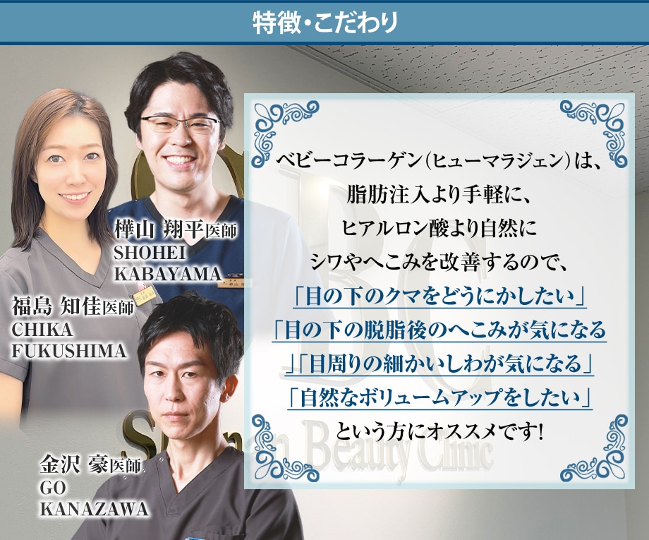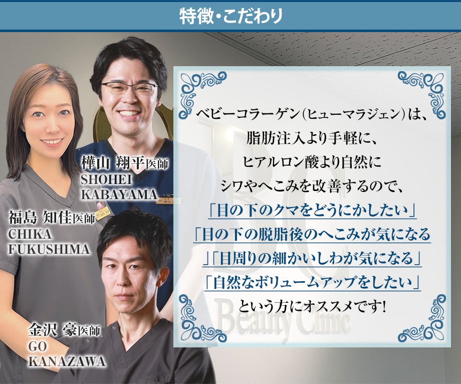 特にヒアルロン酸やボトックスが難しい目周りの小じわに効果的で、ヒト由来の薬剤のためアレルギーのリスクが少なく安全に失われたコラーゲンを補充できる点が特徴です。