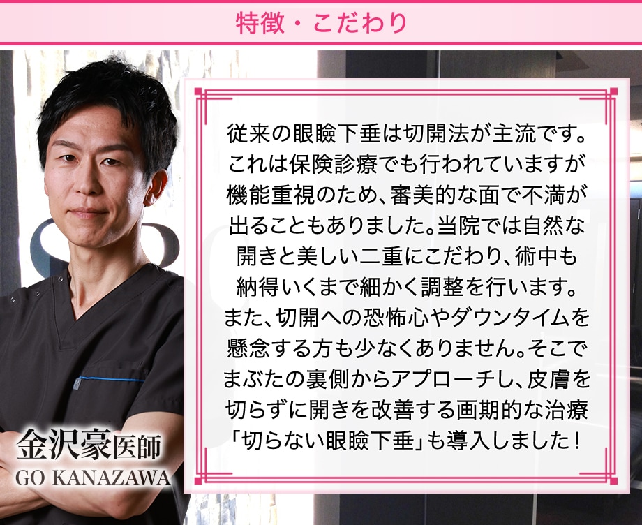 切開する眼瞼下垂手術はもちろん、傷跡を残さずダウンタイムも最小限な「切らない眼瞼下垂(真崎式)」も新導入!
