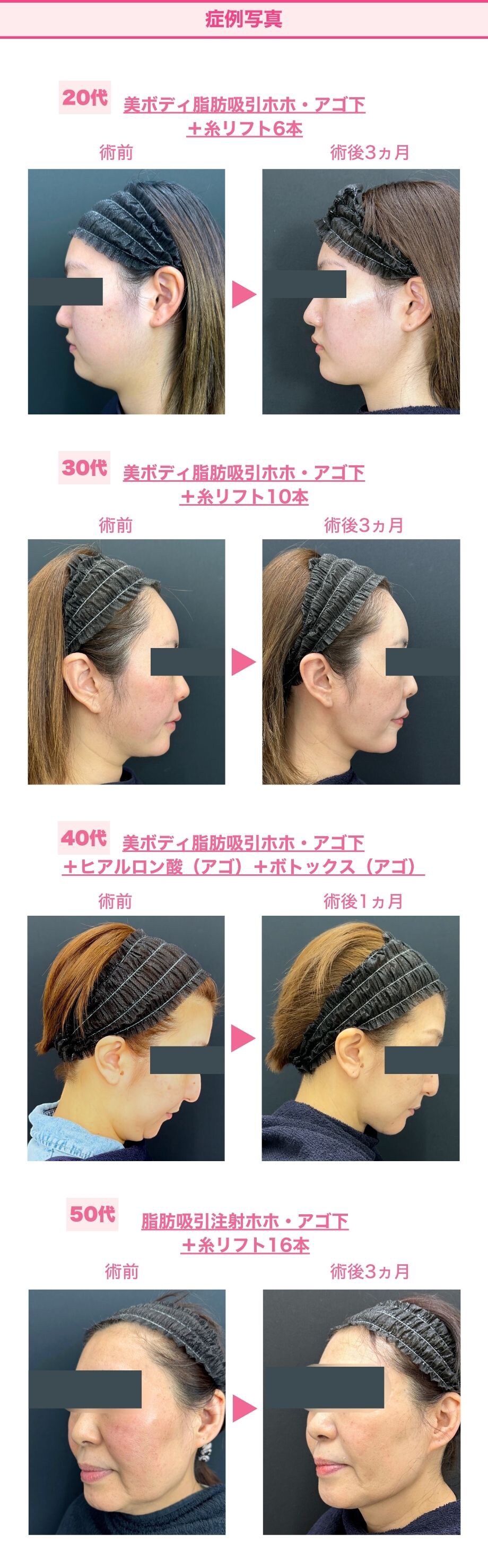 | 小顔用脂肪吸引注射(ホホ+アゴ下+エラ下(麻酔(局所麻酔)代が含まれています。※別途安心麻酔(静脈麻酔)代がかかります。 )) | 144,000円 |