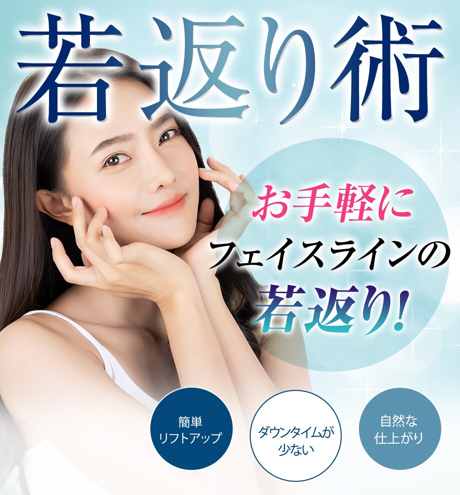 糸リフト(スレッドリフト)は、コグが付いた糸を皮下に挿入しお顔の垂れ下がった下垂脂肪を直接持ち上げ、高い位置に脂肪を再配置する施術です。たるみやほうれい線、マリオネットラインやフェイスラインのもたつきの改善が期待できます。また、糸を挿入することで皮膚の組織が活性化し、コラーゲンが増生されることでお肌のハリ・ツヤアップも期待できます。