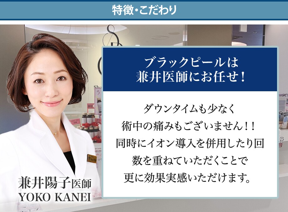 ブラックピールは、Vカーボンシステムを使用した医療機関専用ケミカルピーリングです。植物性活性炭と乳酸をメインとしたピーリング剤で表皮浅層から中層(施術方法により真皮網状層~真皮乳頭層)にかけて浸透し、肌のアンチエイジングに必要な薬効成分が配合されています。また治療プロセスで使用する中和剤には微細化されたヘキサぺプチド成分が含まれており、小じわの改善やリフティング効果も期待できます。