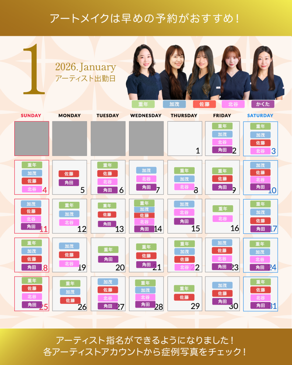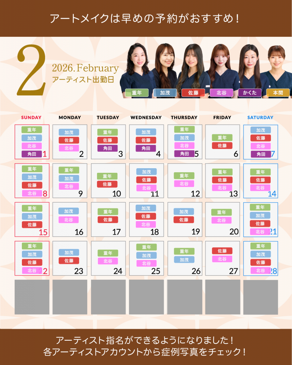 アートメイクアーティスト出勤カレンダー