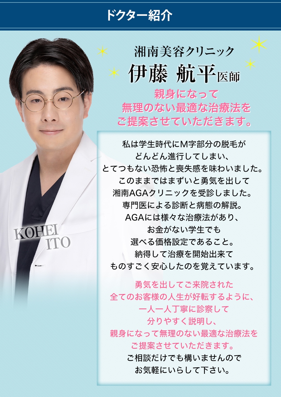 はじめまして。湘南AGAクリニック新宿本院 医師の伊藤航平です。
