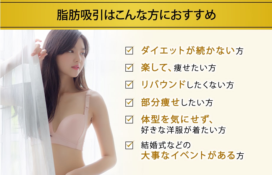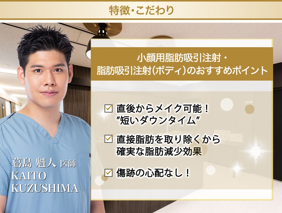 切開なしで脂肪を直接抽出できるので、脂肪溶解注射より確実に、脂肪吸引よりダウンタイムを少なく、狙った部分の脂肪を減らすことができる安全・確実・簡単な部分やせ術です。