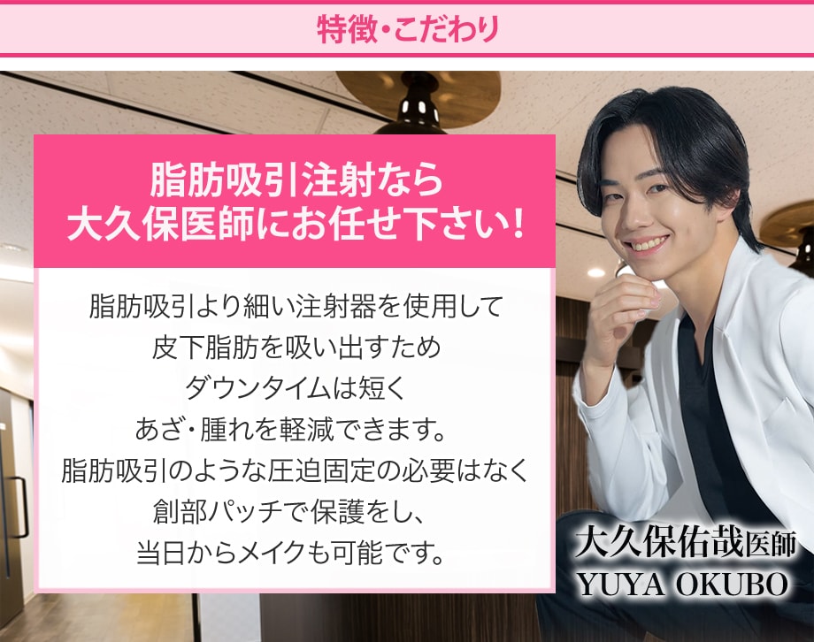 切開なしで脂肪を直接抽出できるので、脂肪溶解注射より確実に、脂肪吸引よりダウンタイムを少なく、狙った部分の脂肪を減らすことができる安全・確実・簡単な部分やせ術です。脂肪溶解注射よりもっと効果が欲しい、脂肪吸引はなんだか怖いといった方におすすめの施術です。