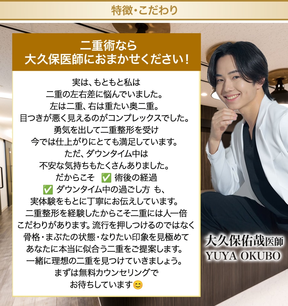 自分自身二重埋没を受けたから自分が担当させて頂くお客様には笑顔になって欲しい、そんな思いで向き合っています。