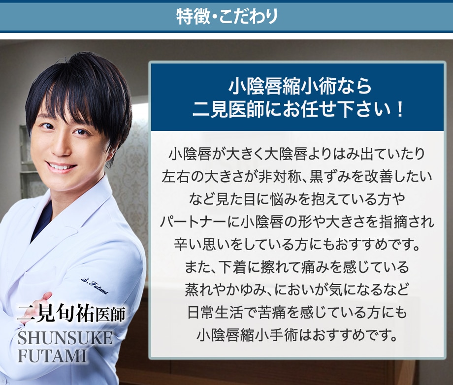 形成外科出身の二見医師が行う小陰唇縮小術でデリケートゾーンのお悩みを解決します。