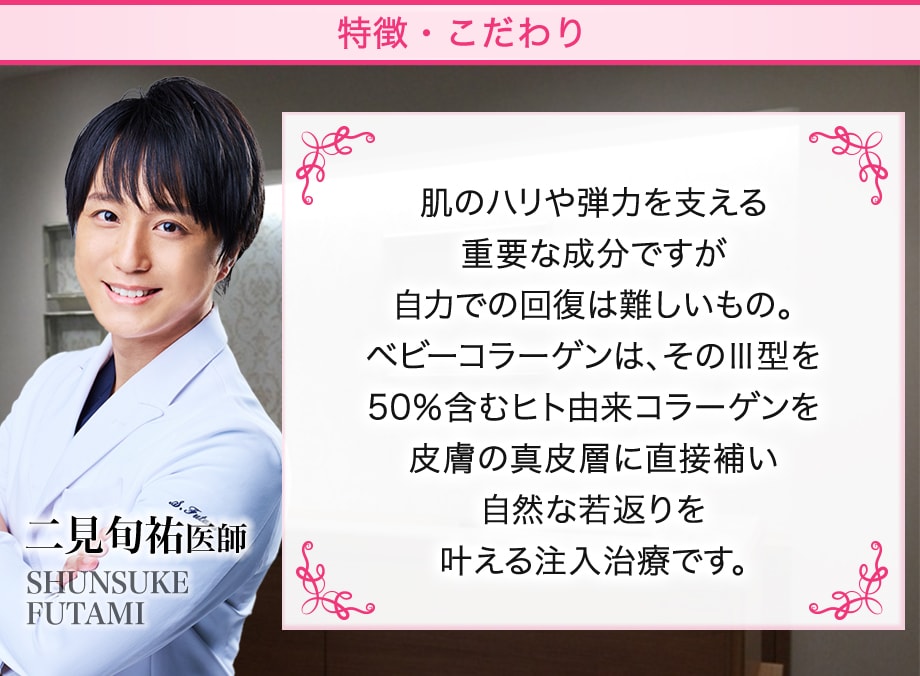 ベビーコラーゲンとは、世界初Ⅰ型コラーゲンとⅢ型コラーゲンを50:50で配合された唯一のヒト胎盤由来コラーゲン注入剤です。