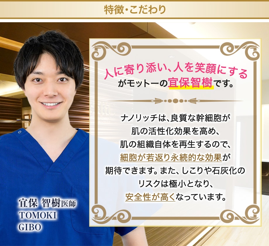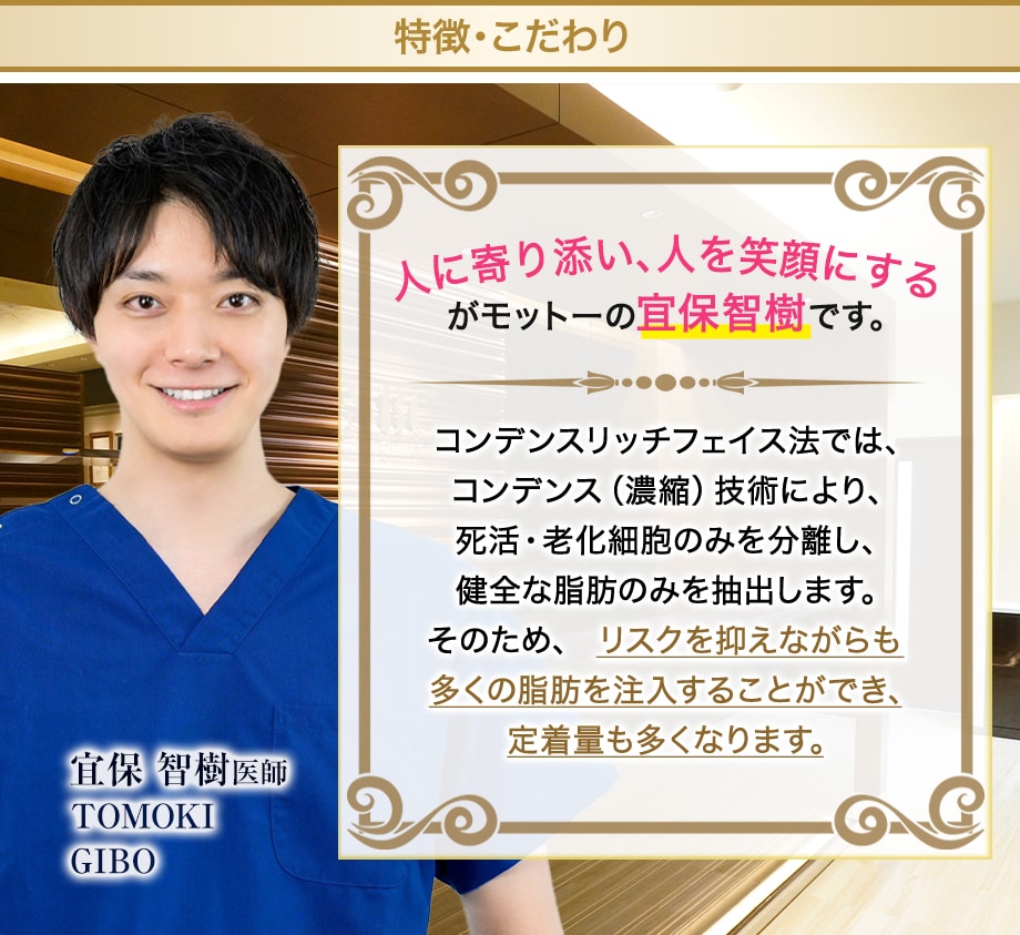脂肪から極少量しか取れない研ぎ澄まされた良質な幹細胞と小さな脂肪からなる不純物の少ない極小脂肪を、複数の注入口から注入するクリスクロス法で実現する、永続的な効果が期待できる究極の若返り術です。