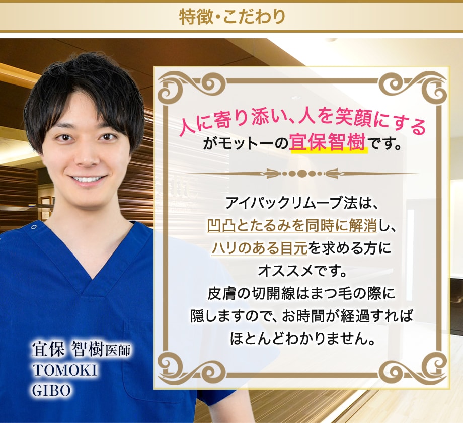 アイバックリムーブ法は、目の下の余剰皮膚切除&眼窩脂肪除去を行い目袋と皮膚のたるみを改善する方法です。