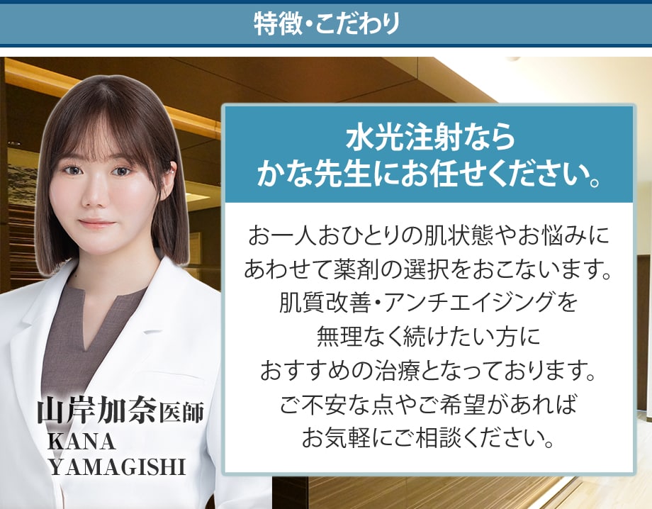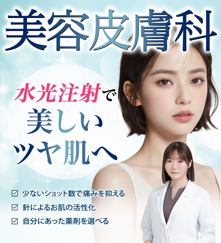 水光注射は、美肌成分を肌の浅い層に均一に注入することで、内側からうるおい・ハリ・透明感を引き出す治療です。