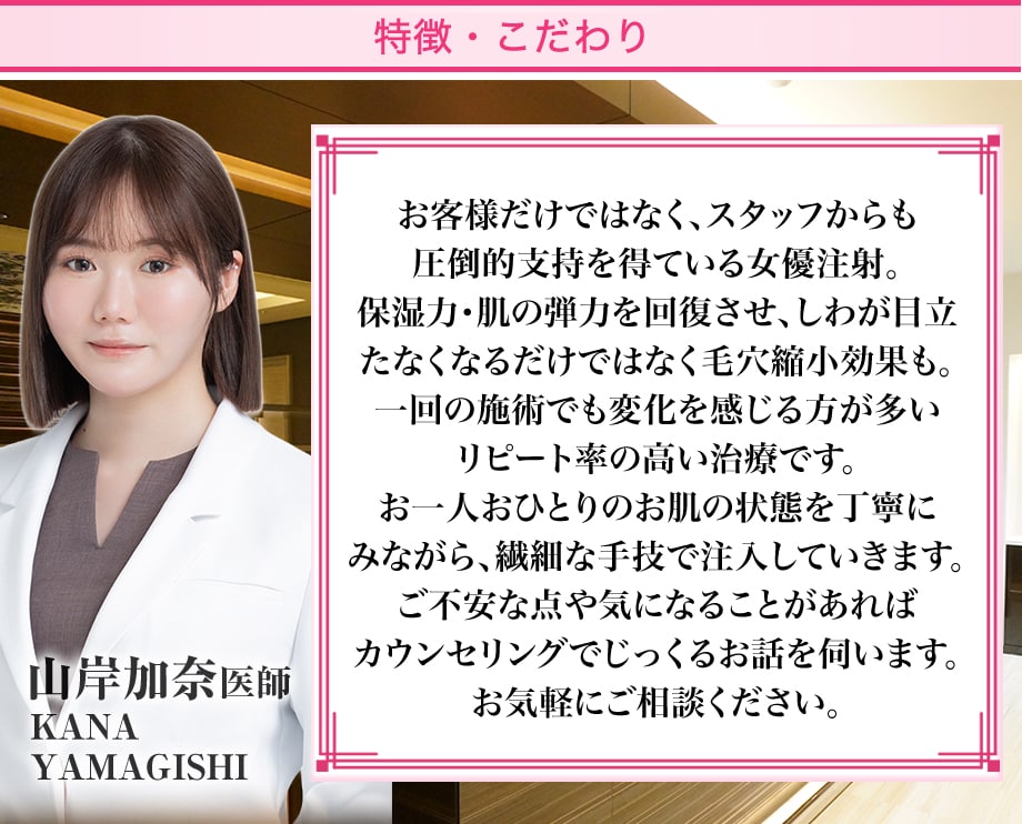 お客様だけではなく、スタッフからも圧倒的支持を得ている女優注射。