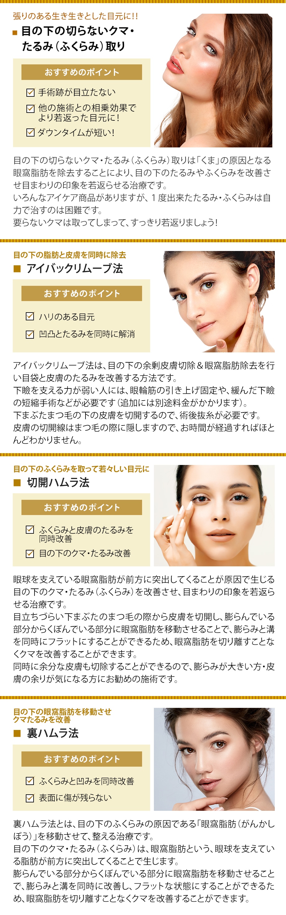 目の下の切らないクマ・たるみ取りは、たるみの原因「目袋3脂肪」をまぶたの裏側から除去する治療です。