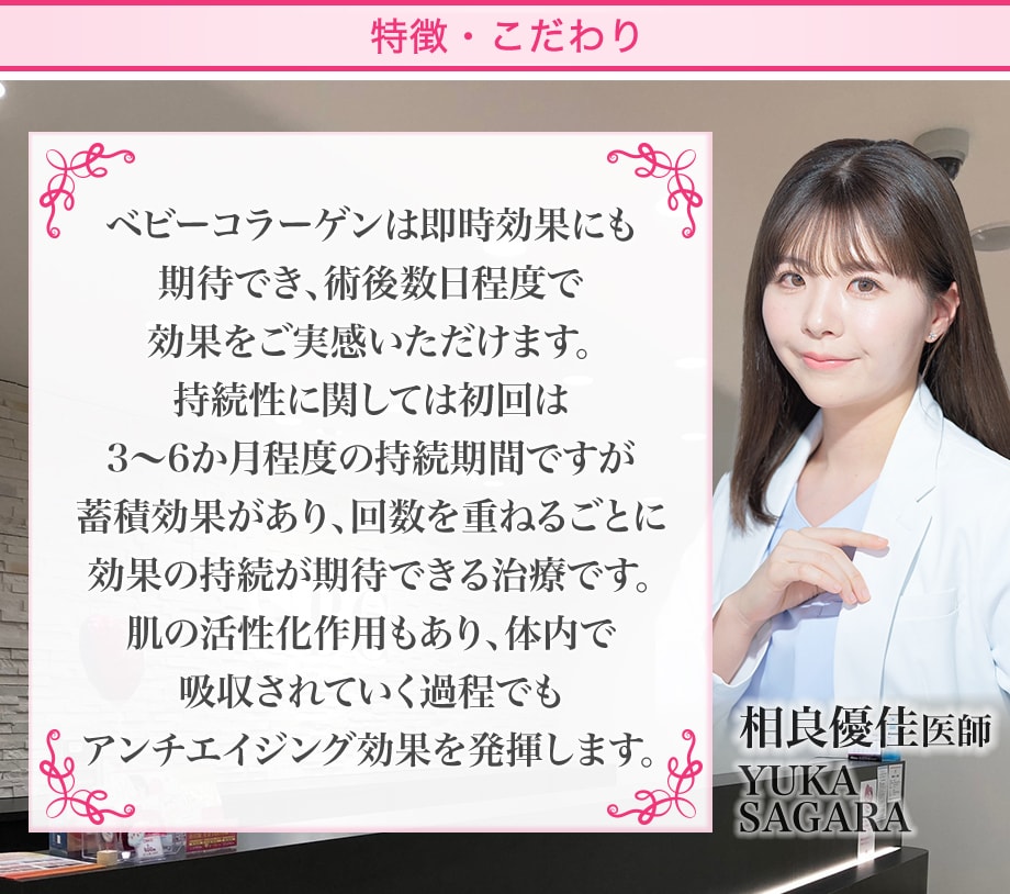 肌にコラーゲンを注入することで「肌細胞の再生・活性化」「肌のボリュームアップ」「ハリ改善」「小じわの改善」を目的とした治療です。ベビーコラーゲンの働きにより、皮膚組織を再生、肌の弾力や保湿力を上げる事ができます。また、目周りのシワ等ヒアルロン酸やボトックスでは難しいといわれるような細かい部位も得意としており、柔らかい薬剤を使用しているため目周りにもなじみます。ヒト由来のコラーゲンを使用しているため、アレルギーの心配も少なく安全に治療を受けていただけます。
