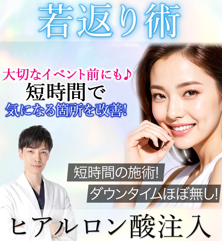 ヒアルロン酸は人体にもともとある物質です。コラーゲン組織の組織を保持する働きが認められており、肌組織の水分、潤滑性、柔軟性を保つのに役立っています。ヒアルロン酸の注入に使用される製剤は透明なジェル形態です。ヒアルロン酸の注入を行うと、もともと体内に存在していた自己のヒアルロン酸と融合して皮膚にふくらみを持たせ、シワを隆起させます。注入することでシワを改善のみならず顔を支える靭帯を調整し若返りが可能な施術です。