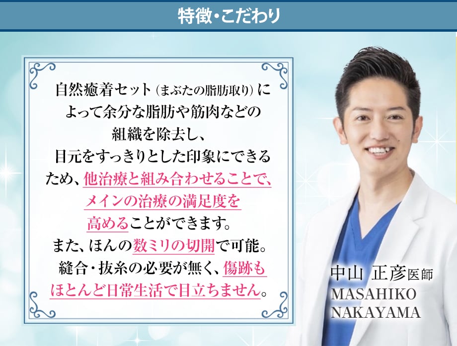 自然癒着セット(まぶたの脂肪取り)は、まぶたをわずか数ミリ切開し、余分な眼窩脂肪を除去することにより、まぶたの
