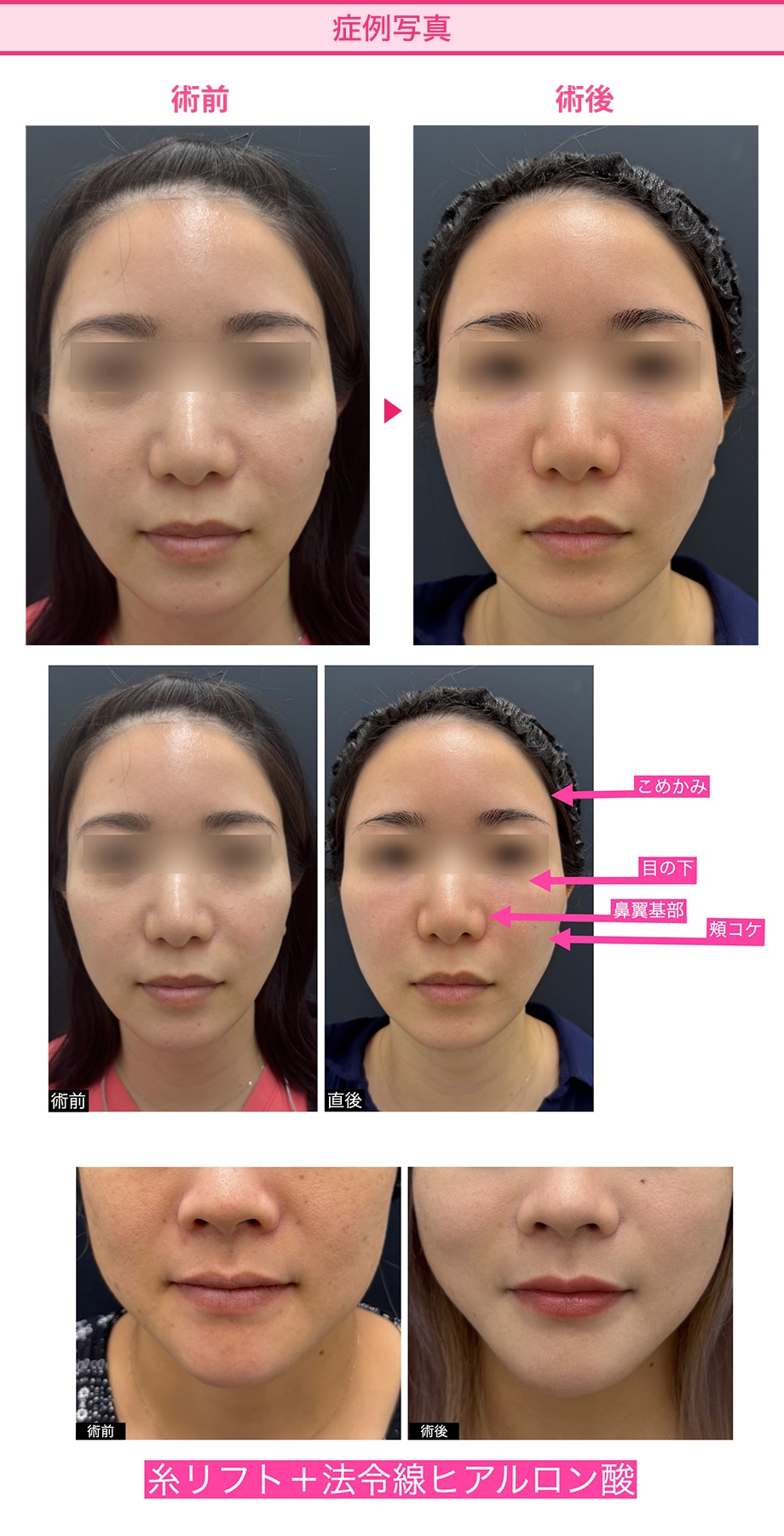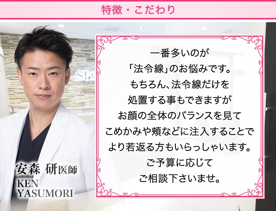 ヒアルロン酸は元よりヒトの体内に存在している物質です。体内ではコラーゲン組織の保持、肌組織の水分・潤滑性・柔軟性の保持などの役割を果たしています。注入されたヒアルロン酸は、元より体内にある自身のヒアルロン酸と融合し、皮膚にふくらみが生まれます。このふくらみがシワの充填剤となり、シワの凹みを持ち上げることで、くぼんだ肌がなだらかになりシワが改善されます。