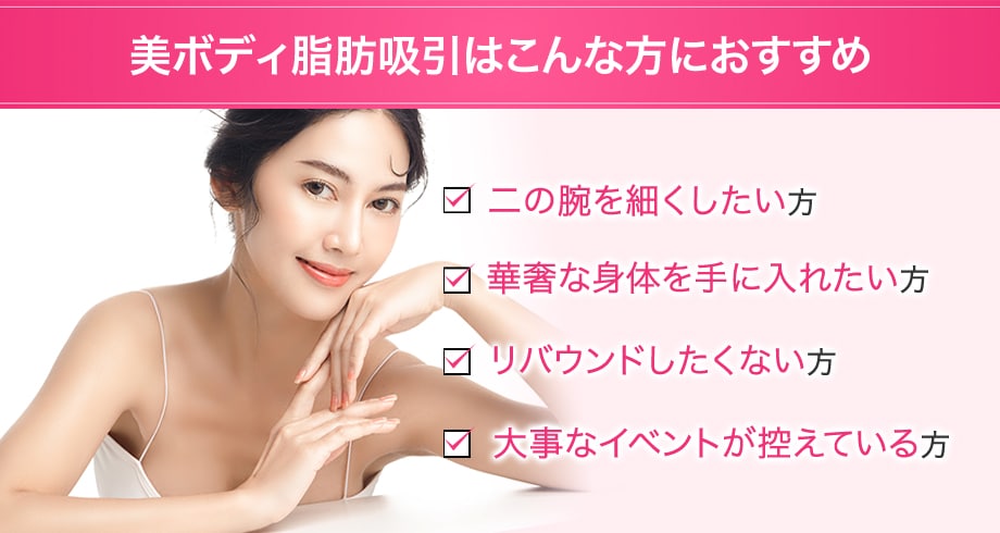 傷跡が目立たず効果を実感できる人気施術です。吸引により直接的に脂肪を除去することで、リバウンドしにくい二の腕の部分痩せを実現します。