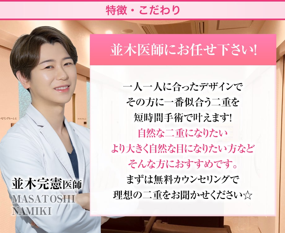外科専門医の並木が美術のセンスを活かし、それぞれのお客様に合ったデザイン・治療をご提案し、理想の美しい二重を叶えます。