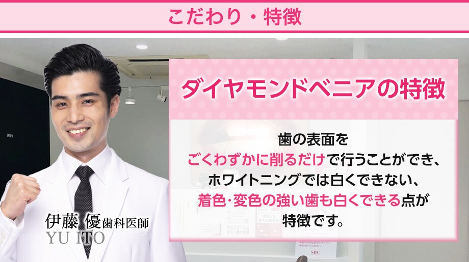 ダイヤモンドベニアは、歯の表面を最小限に削り、薄いセラミック素材を貼り付けて美しい歯をつくる治療です。従来のセラミッククラウンのように大きく削る必要がないため、歯への負担を抑えられるのが特徴です。さらに、保険治療後の変色や、神経やテトラサイクリンによる変色など、ホワイトニングでは白くなりにくい歯も、自然で美しい仕上がりを目指すことができます。