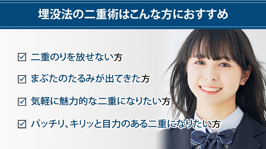埋没法とは、医療用の細い糸をまぶたの皮下に埋没固定し、二重のラインを作る方法です。