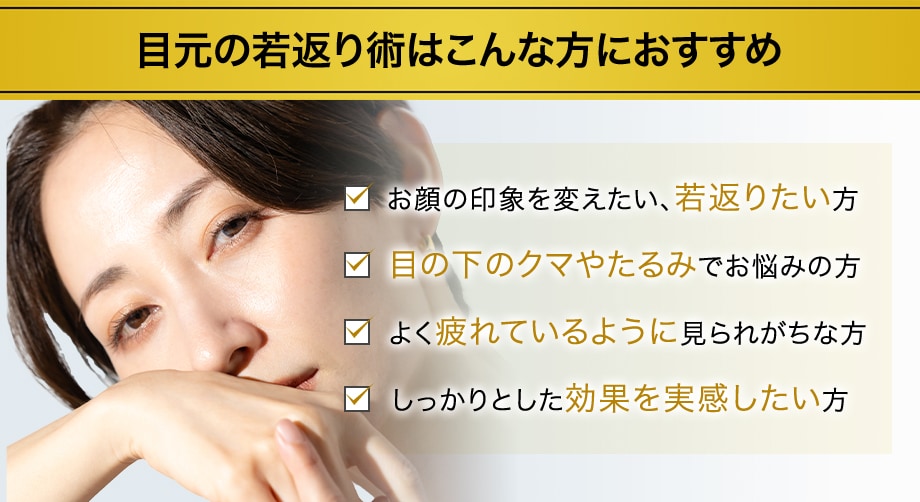 下瞼を支える力が弱い人には、眼輪筋の引き上げ固定や、緩んだ下瞼の短縮手術などが必要です(追加には別途料金がかかります)。