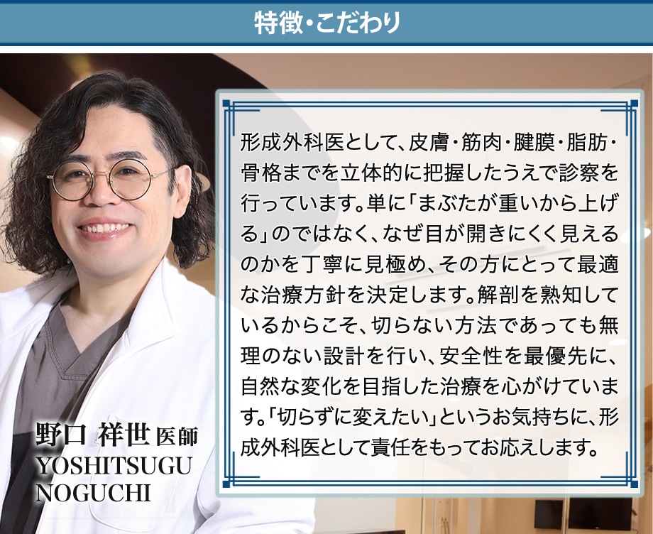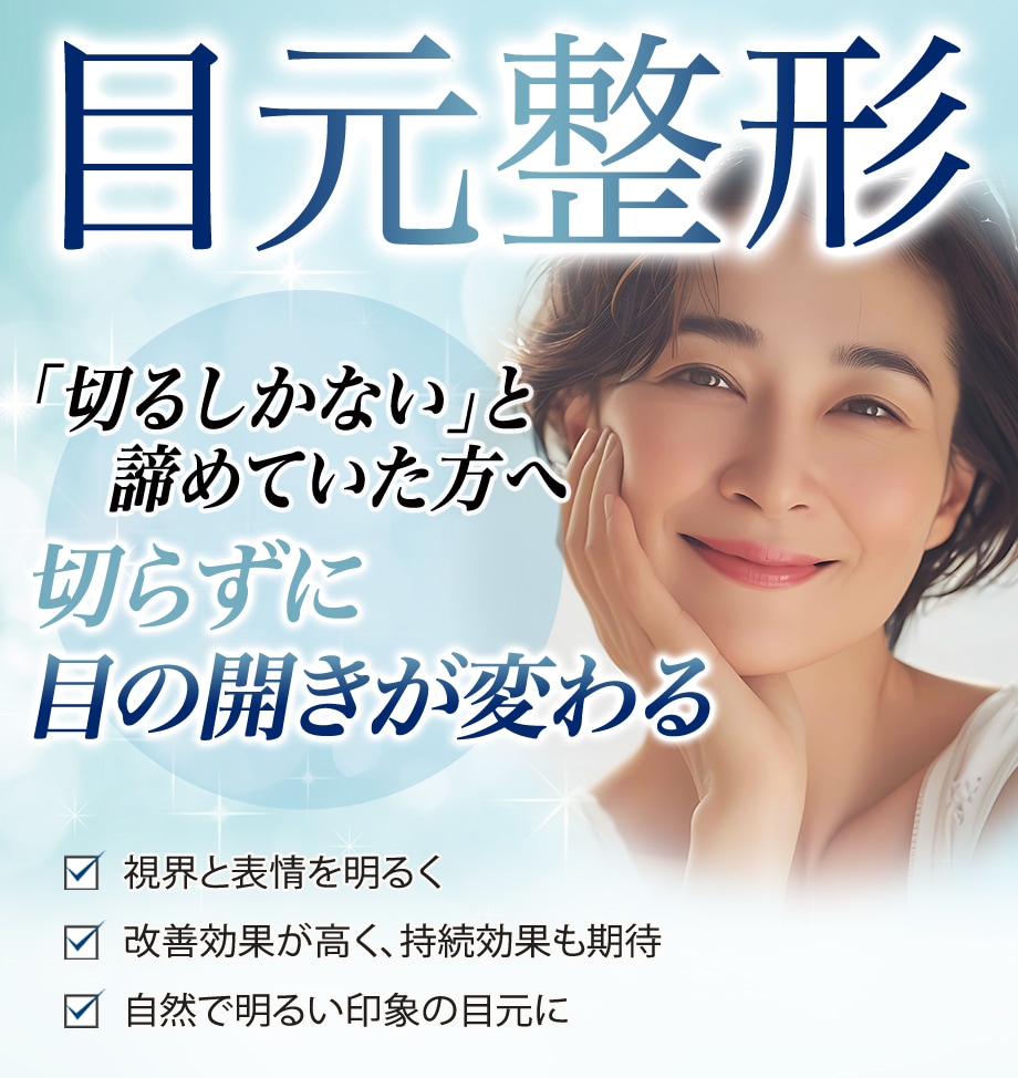 これまで眼瞼下垂の改善は、まぶたにメスを入れる切開法が一般的でした。効果は確実なものの、ダウンタイムや傷跡への不安から「切らずに治したい」「仕事を休めない」という多くの声が寄せられていました。SBCでは、その声に応えるため切らない眼瞼下垂の技術習得に取り組んできました。しかし従来の非切開法には、効果が弱い・後戻りしやすいといった課題がありました。そこでSBCは、切らない眼瞼下垂治療で多くの実績を持つ真崎医院・真﨑医師から直接指導を受け、細かな手技から安全性まで徹底的に学び、研修を重ねました。その結果、切らずにしっかり効果を実感できる、最新の「切らない眼瞼下垂法」として皆さまに提供できるようになりました。「切るしかない」と諦めていた方にも、安心して選べる新しい選択肢が生まれたと考えています。まぶたの開きだけでなく、左右差の改善や“眠そうに見える印象”の解消にもつながり、生き生きとした表情へ整えることができます。幅広い年代の方に、“前向きな変化”をご提供できる施術です。