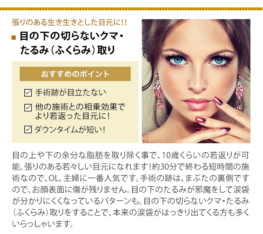 一度眼窩脂肪が目立つようになってしまった場合、マッサージやスキンケアでの改善は難しくなりますが、手術をされることでたるみやクマの無いハリのある目元に生まれ変わります。