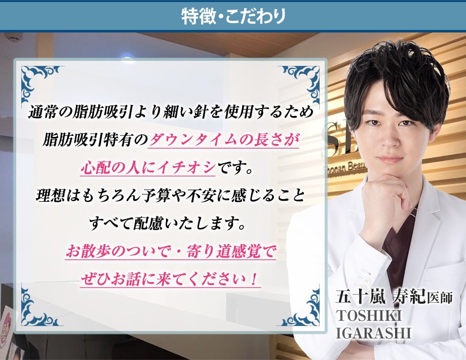 切開なしで脂肪を直接抽出できるので、脂肪溶解注射より確実に、脂肪吸引よりダウンタイムを少なく、狙った部分の脂肪を減らすことができる安全・確実・簡単な部分やせ術です。