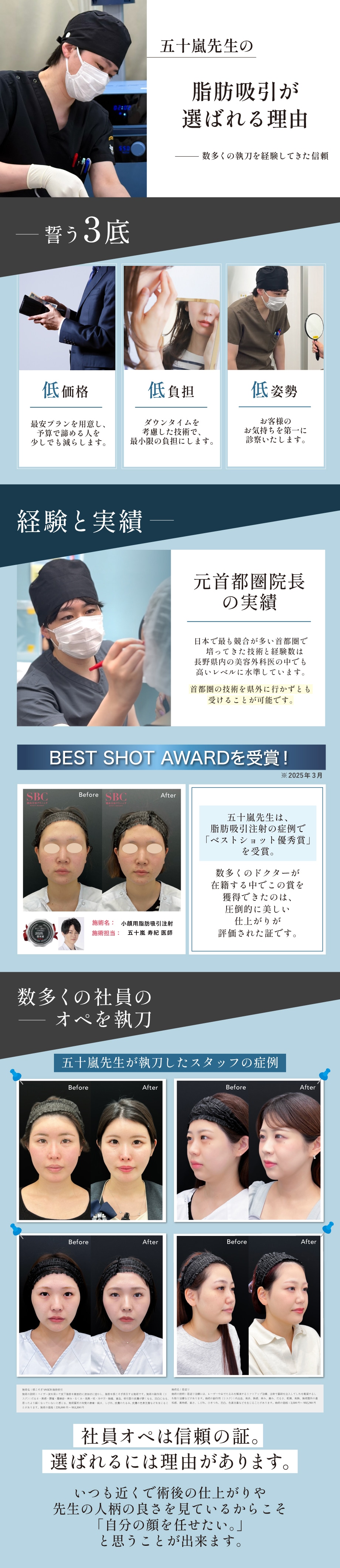 | 小顔用脂肪吸引注射(アゴ下+エラ下(麻酔(局所麻酔)代が含まれています。※別途安心麻酔(静脈麻酔)代がかかります。 )) | 105,000円 |
