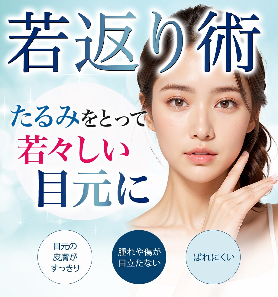 眉下リフト(眉下切開)は、眉下のたるんだ皮膚を切開して引き上げる、たるみ改善の施術です。まぶたのたるみによって目の開きが悪くみえたり、本来の二重ラインが隠れてしまったりすることがあります。 まぶたの余剰皮膚を除去して引き上げ、眉毛に沿って縫合することで、傷跡がほとんど目立ちません。二重術なしで目ヂカラUPや若返りの効果が期待できます。