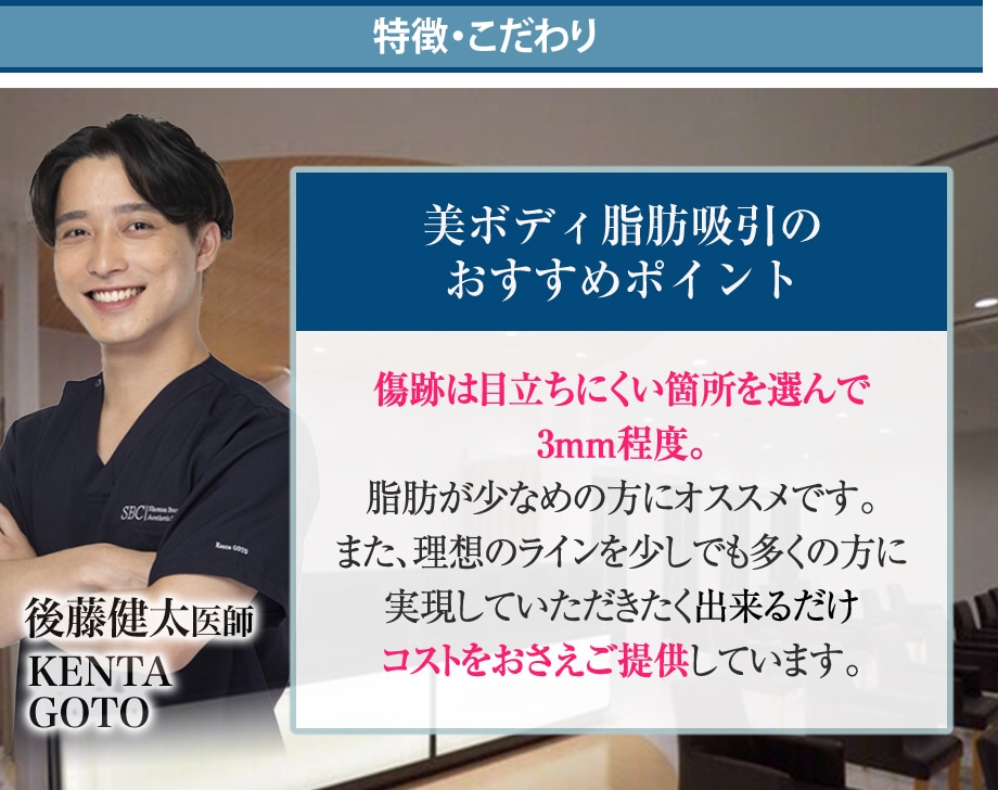| 脂肪吸引注射(ボディ)(肩甲骨横・ブラ上・ブラ下いずれか(麻酔(局所麻酔)代が含まれています。※別途安心麻酔(静脈麻酔)代がかかります。 )) | 109,220円 |