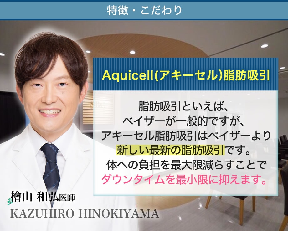 Aquicell(アキーセル)脂肪吸引は、次世代の高周期振動技術を採用した脂肪吸引システムです。 皮下の組織や血管のダメージを最小限にすることで吸引後の出血を少なくし、脂肪吸引時の痛みを減らすことが可能です。
