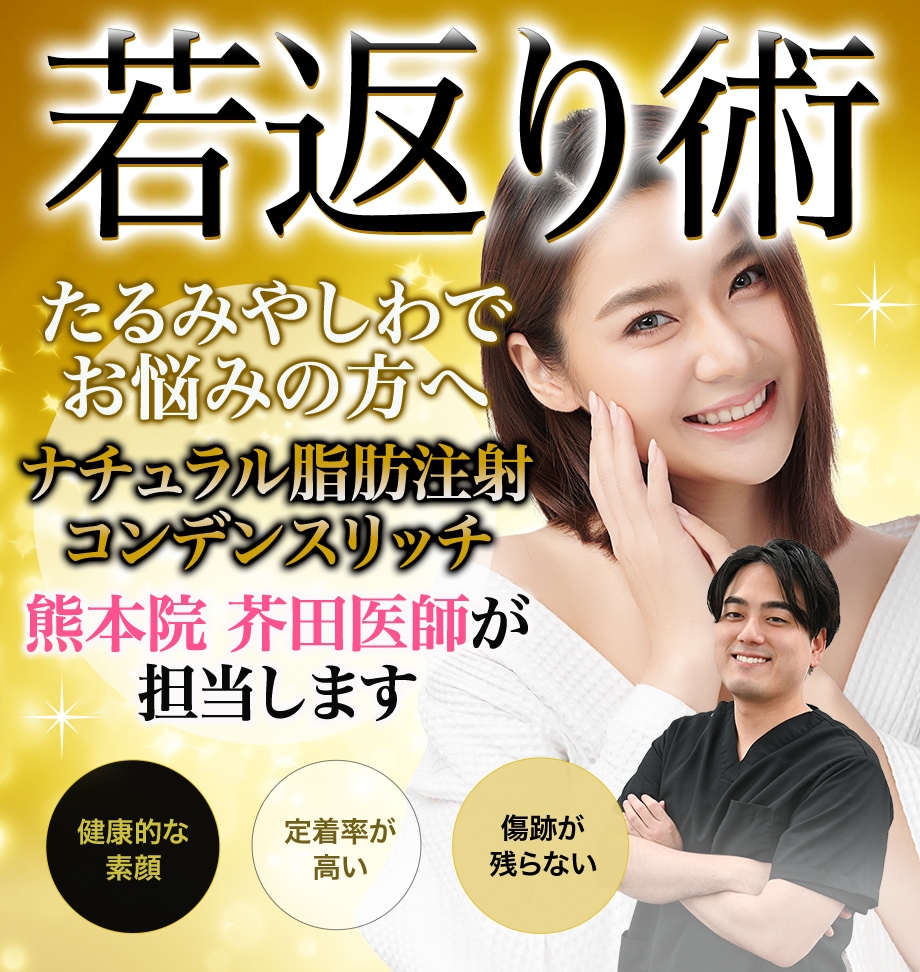 ナチュラル脂肪注射コンデンスリッチとは、ご自身の脂肪を注入することで、注入箇所にハリと潤いを蘇らせ、ふっくらとして丸みを帯びた健康的な素顔を形成することができます。