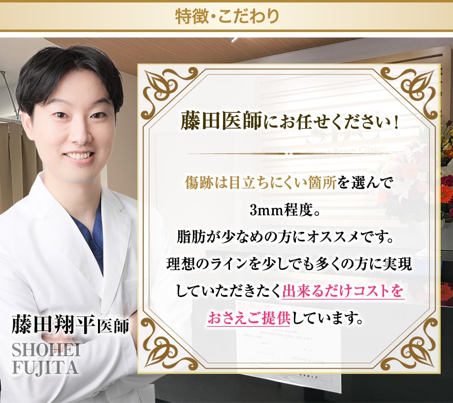 元整形外科医である藤田医師による骨格を活かしたナチュラルに部分痩せを叶える脂肪吸引のモニター募集です。