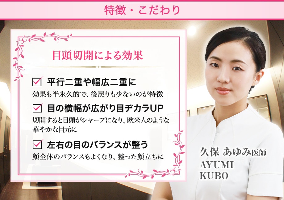 目頭切開とは、目頭を数ミリ切開して「蒙古(もうこ)ひだ」を取り除くことで、目を大きくみせたり、左右の目のバランスを整える施術です。埋没二重術だけでは二重ラインを作るのが難しい方も、目頭切開を併用することで理想の二重を手に入れることができます。