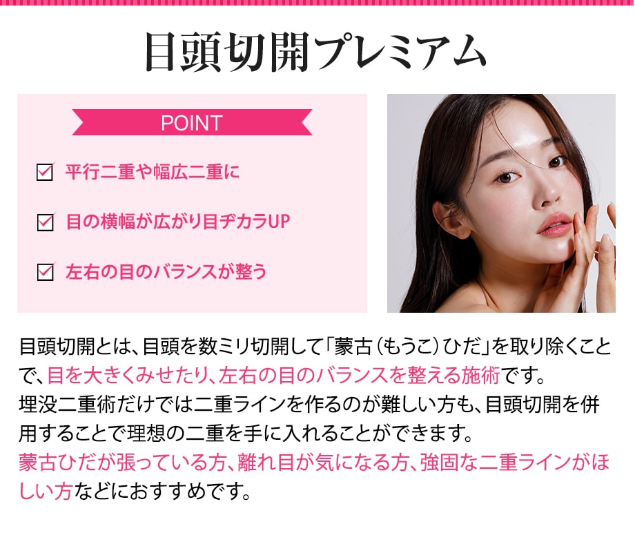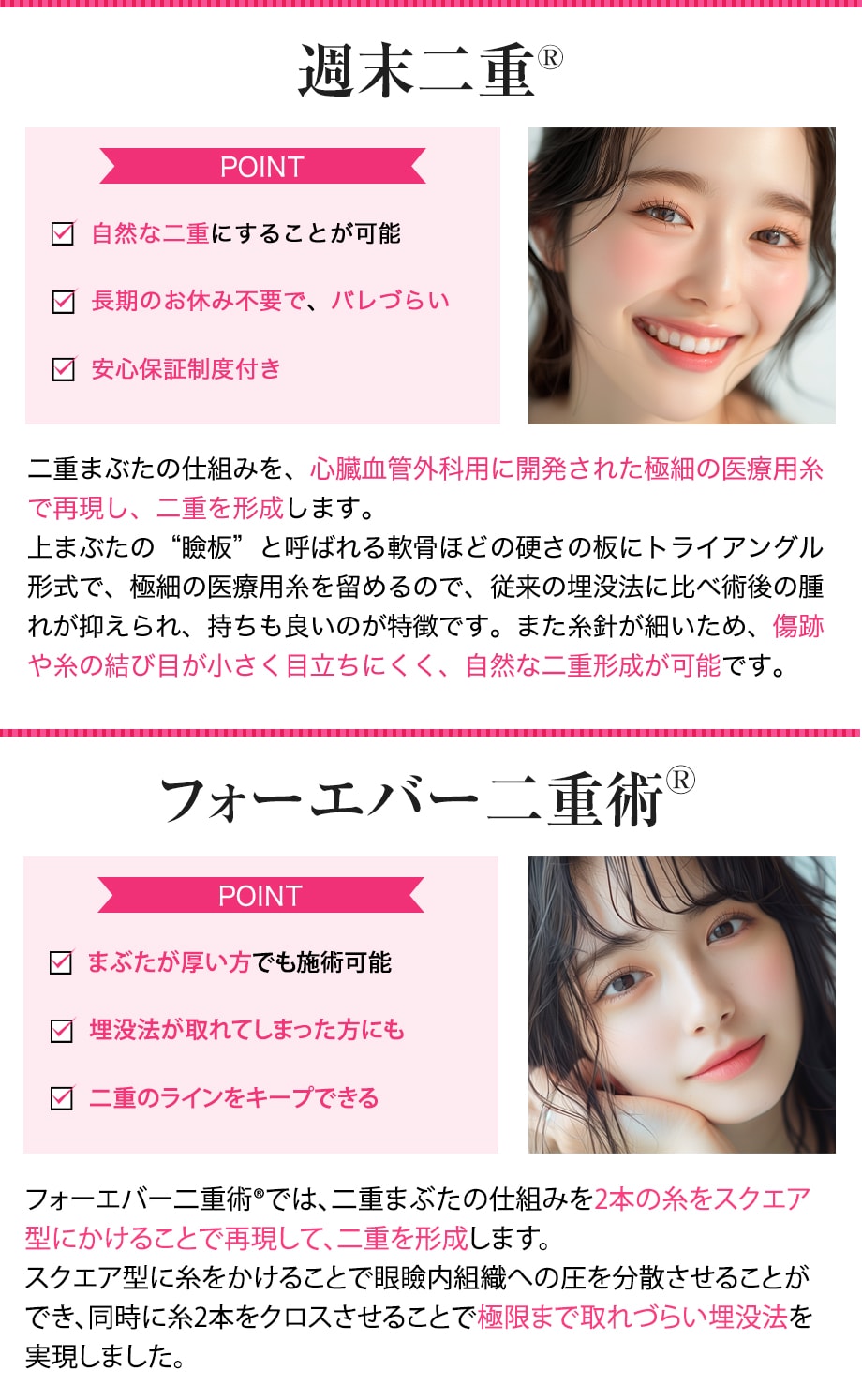 埋没法では二重のラインが取れてしまったり薄くなってしまう方、またまぶたの厚みがあり埋没法で二重を作るのが難しい方におすすめです。