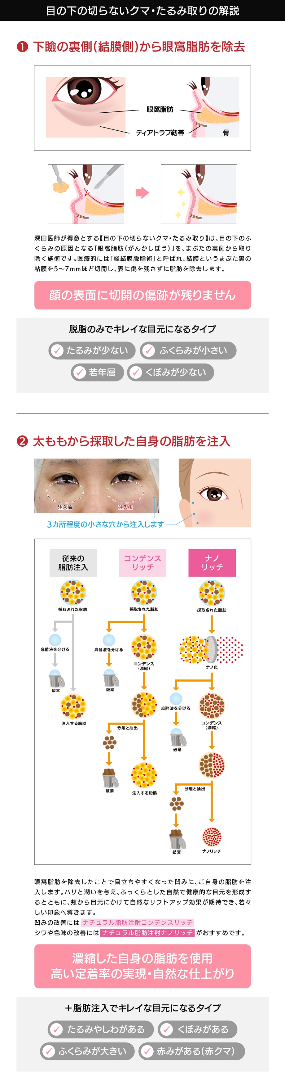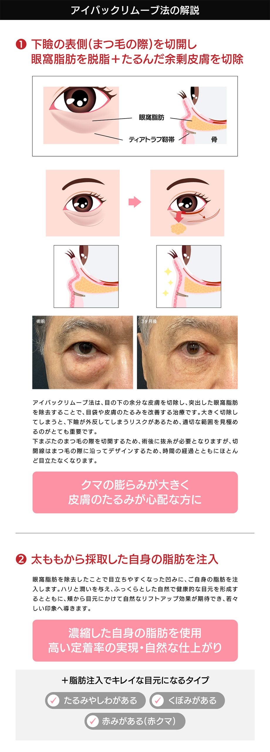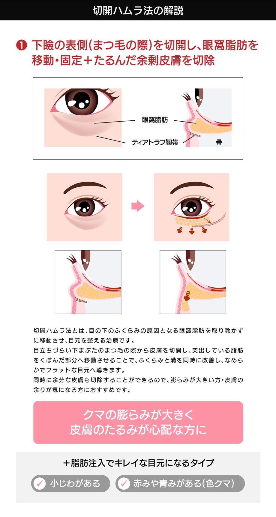 膨らんでいる部分からくぼんでいる部分に眼窩脂肪を移動させることで、膨らみと溝を同時に改善し、フラットな状態にすることができるため、眼窩脂肪を切り離すことなくクマを改善することができます。