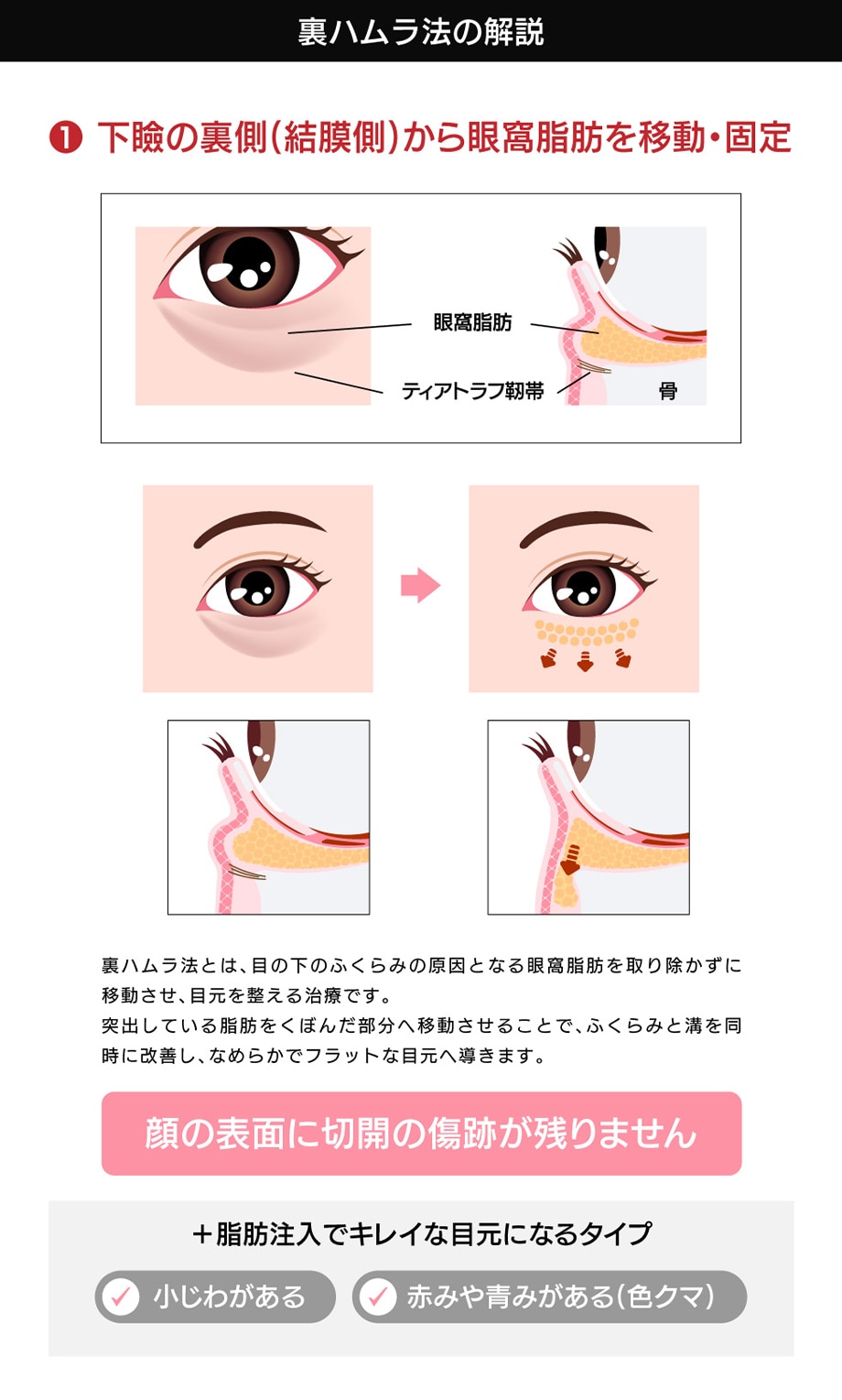 裏ハムラ法とは、目の下のふくらみの原因である「眼窩脂肪(がんかしぼう)」を移動させて、整える治療です。