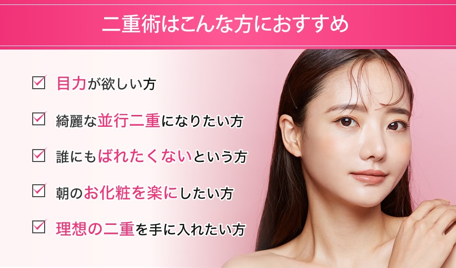 細くてしなやかなため切れる可能性は少なく生体との反応も安定している糸です。二重のラインとなる皮膚の部分をまぶたの内側から留めるだけなので、傷も見えず、抜糸の必要もありません。