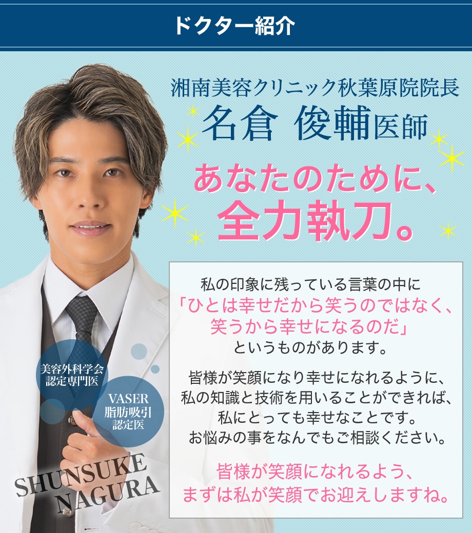 SBCドクター465名中でNo.1の実績を誇る名倉医師が、あなたの理想のフェイスラインを実現します。