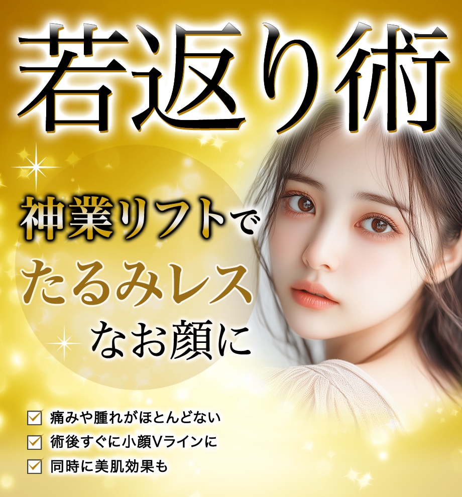Dr.新海による神業リフトはテスリフトと他の糸と組み合わせることにより、長期的な持続としっかりとした引上げ効果を同時にかなえる治療法です。