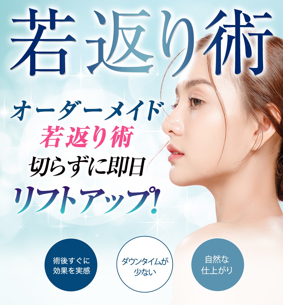 糸リフト術は、頬やフェイスラインの皮下に糸を通し引き上げることで、小顔効果と若返り効果をもたらします。施術直後から効果を感じていただけるだけでなく、糸の周囲でコラーゲンが作られることで美肌効果も期待できます。糸の挿入口は髪の毛で隠れる部分なので極めてバレにくいです。糸の種類や本数は、引き上げたい部分やお客様の状態を診察させて頂いた上で、ご提案させて頂きますのでどの糸リフトが自分にあっているのか分からない方も安心してご相談へいらしてください。