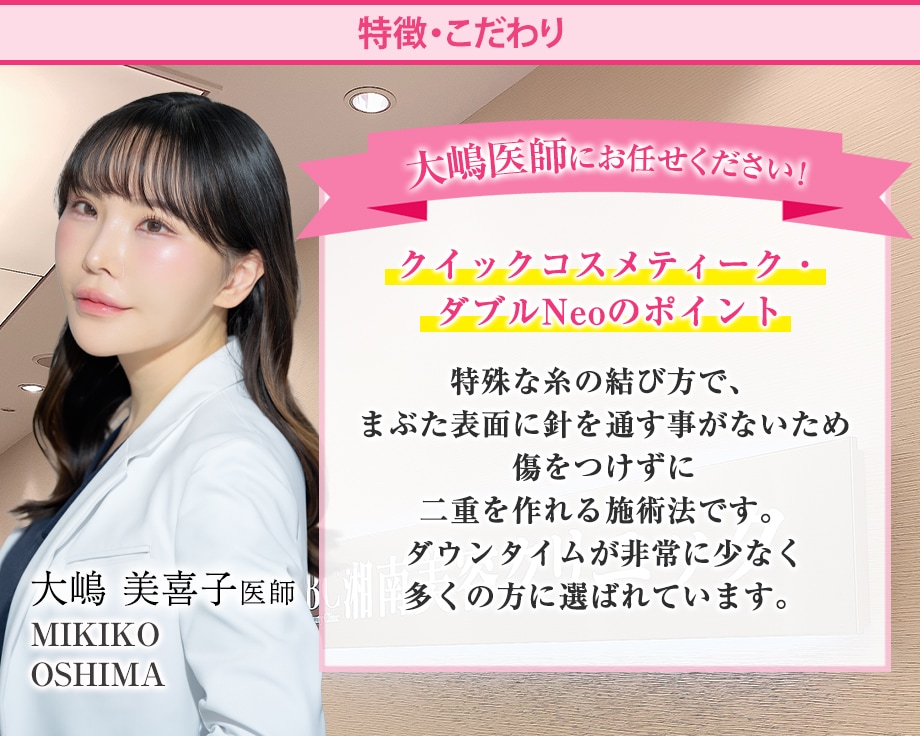 クイックコスメティークNeoは使用する本数に応じて、シングル・ダブルに分かれており片目に使用する糸の本数を表しています。糸の本数が増すごとに持続力が上がるため取れづらい埋没法をご希望の方は、ダブル以上をおすすめします。
